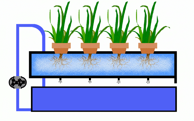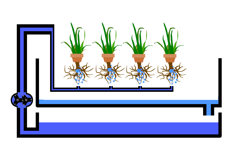 Bei der Tröpfchenbewässerung (Drip System) wrid das System über eine Tropfleitung mit Nährstofflösung versorgt Die Nährstofflösung fließt an den Wurzeln vorbei und versorgt diese direkt. Die überschüssige Flüssigkeit fließt ab. Durch diese Art der Zubringung wird auch Sauerstoff an den Wurzelbereich der Pflanze geliefert.