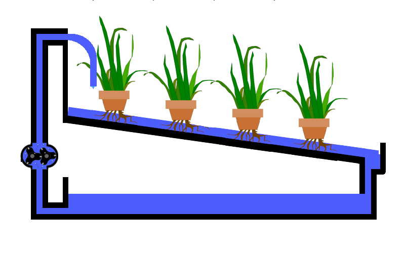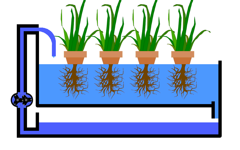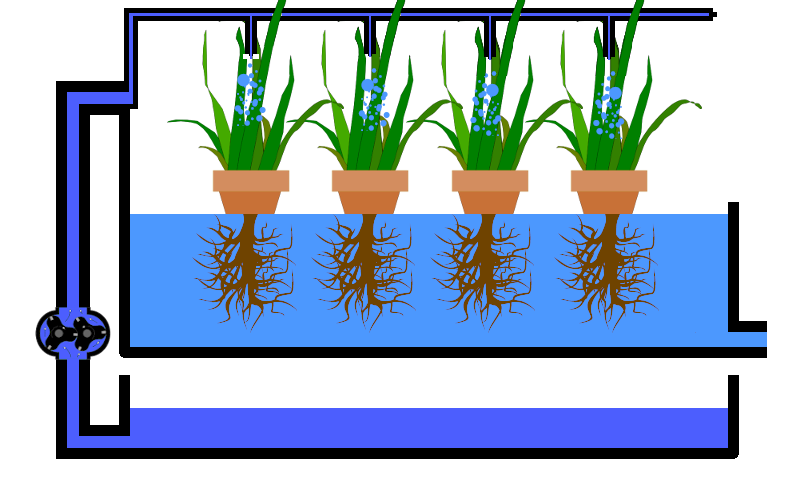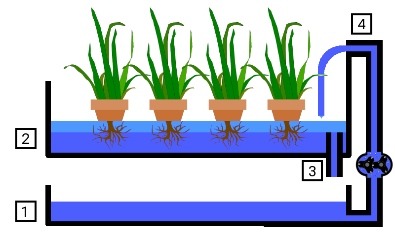 Ebbe-Flut Systeme (Ebb and Flood oder Flood and Drain) verwenden Pumpen (4), die die Pflanzen zeit-gesteuert mit der Nährstofflösung flutet (2). Die Pflanzen sind in einem Netz-Topf eingebettet. Nach Abstellen der Pumpe wird die überschüssige Nährstofflösung über einen Überlauf (3) in den Vorratsbehälter (1) zurückgeführt. Oft bleibt eine Restmenge stehen, um das System weniger anfällig zu machen, falls die Pumpen einmal ausfallen sollten bleibt genug Wasser im Pflanzbecken, da der Überlauf ein Minimum an Wasserversorgung sicherstellt.
