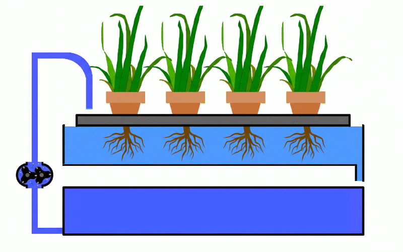 Über das Heben und Senken des Flüssigkeitsspiegels (2) wird im Wurzelbereich Sauerstoff eingebracht, was zu intensiverem Pflanzenwachstum führt. Eine Steuerungselektronik muss den Ebbe-Flut Rhythmus den Anforderungen der Pflanzen anpassen.