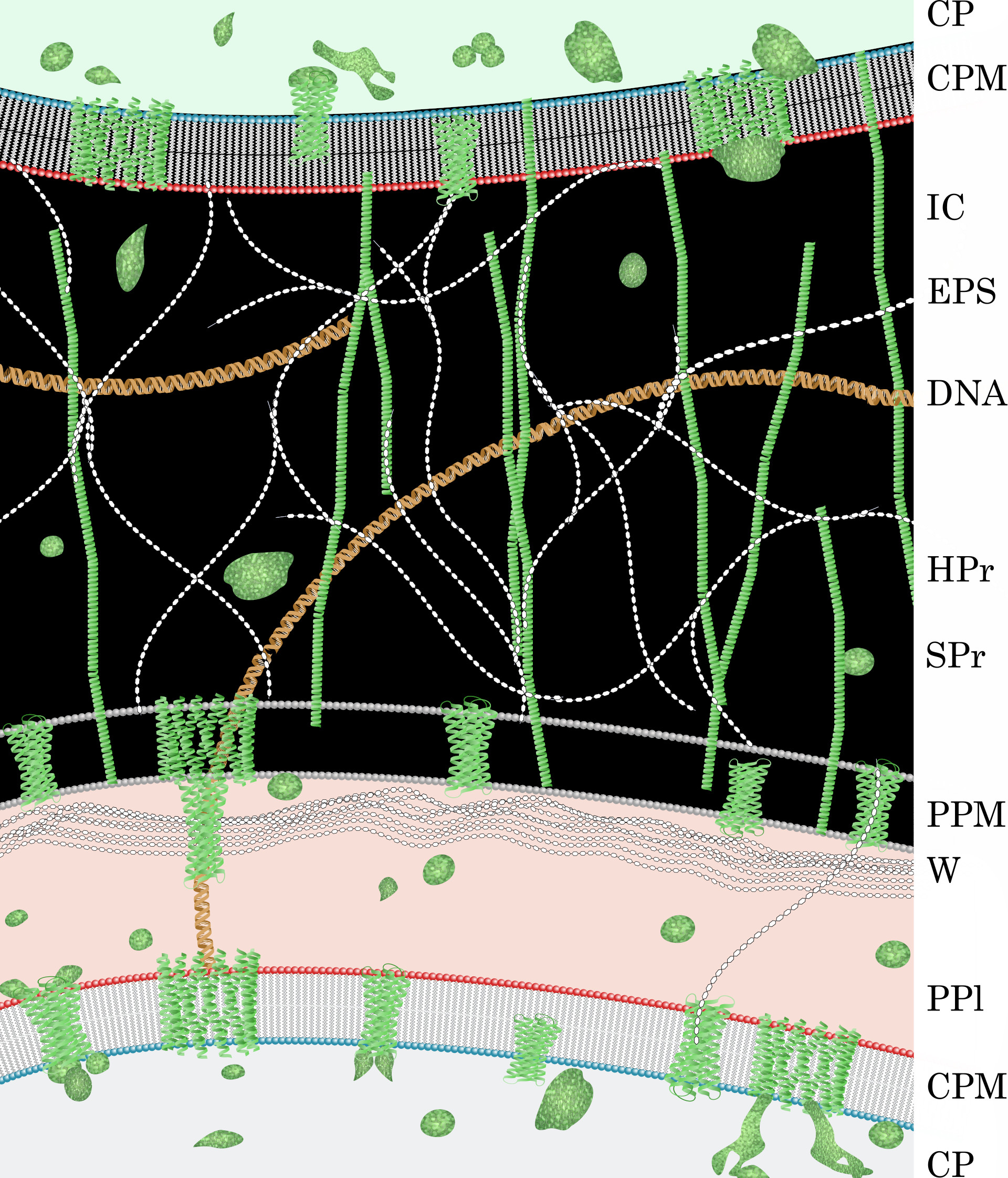 Periplasmamembran (PPM), Zellwand (W), Periplasma (PPl), Cytoplasmamembran und Cytoplasma eines Bakteriums.