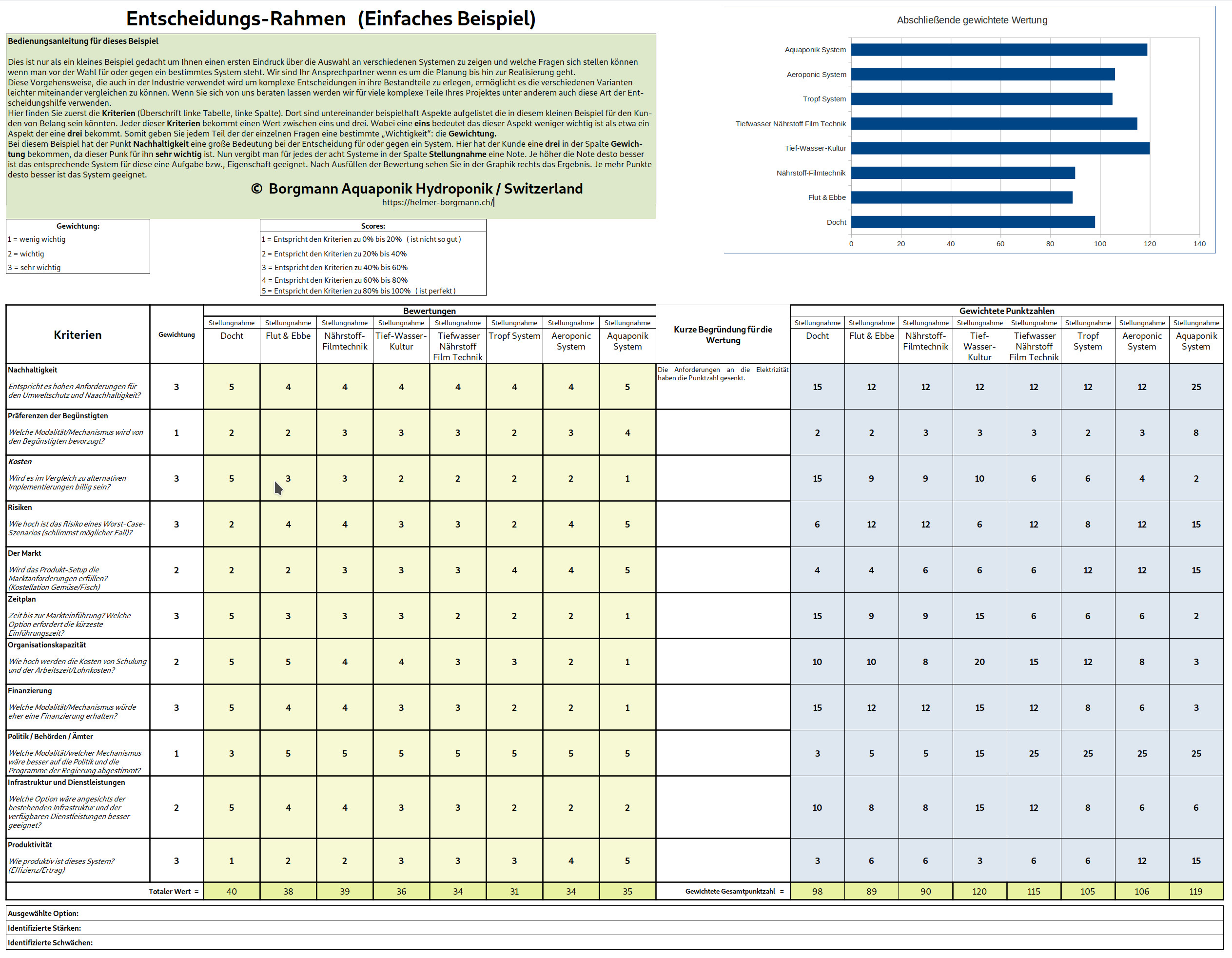 Sie finden in den folgenden Dateiformaten ein Beispiel wie ein solch komplexer Entscheidungsprozess gestaltet werden kann und auch subjektive Aspekte quantifiziert und in Gruppen leichter entschieden werden kann.