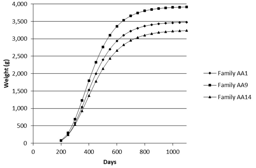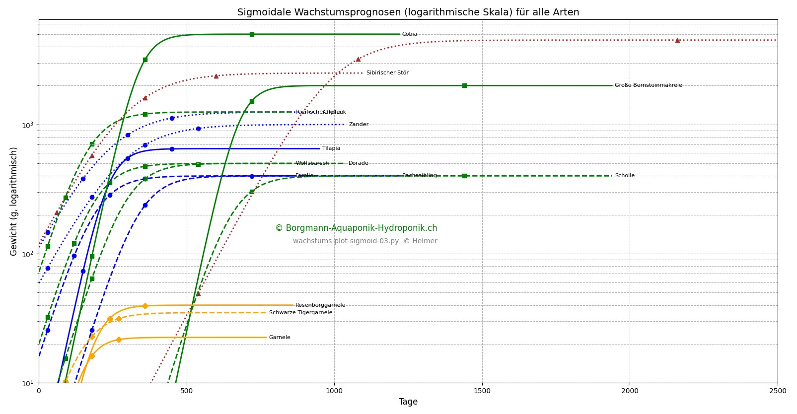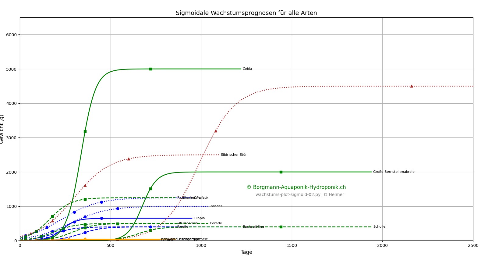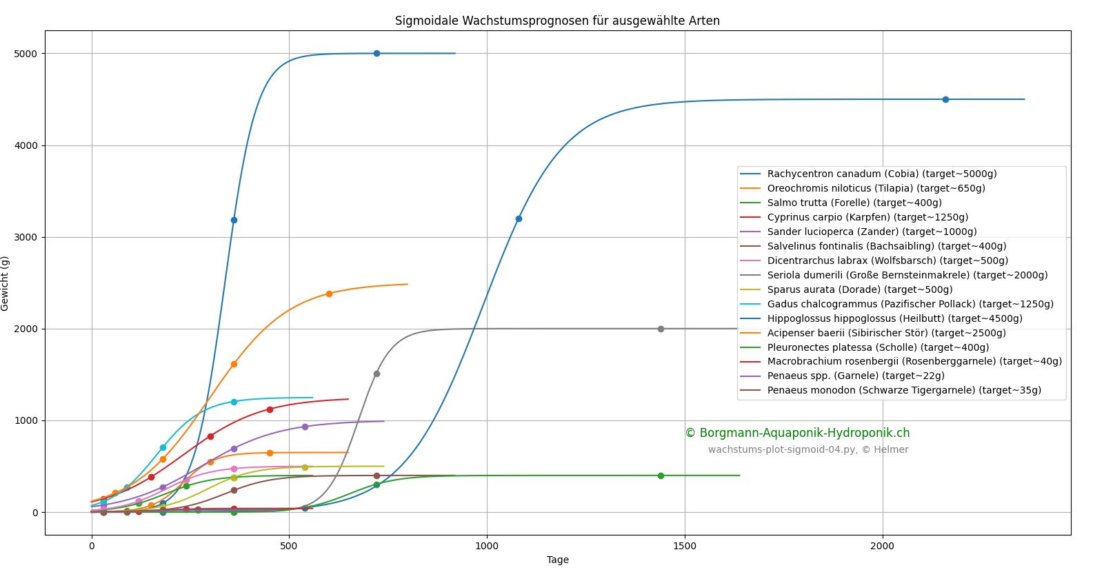 Literature: Jobling, M.: “Fish Bioenergetics” typically shows sigmoid growth curves for many species.